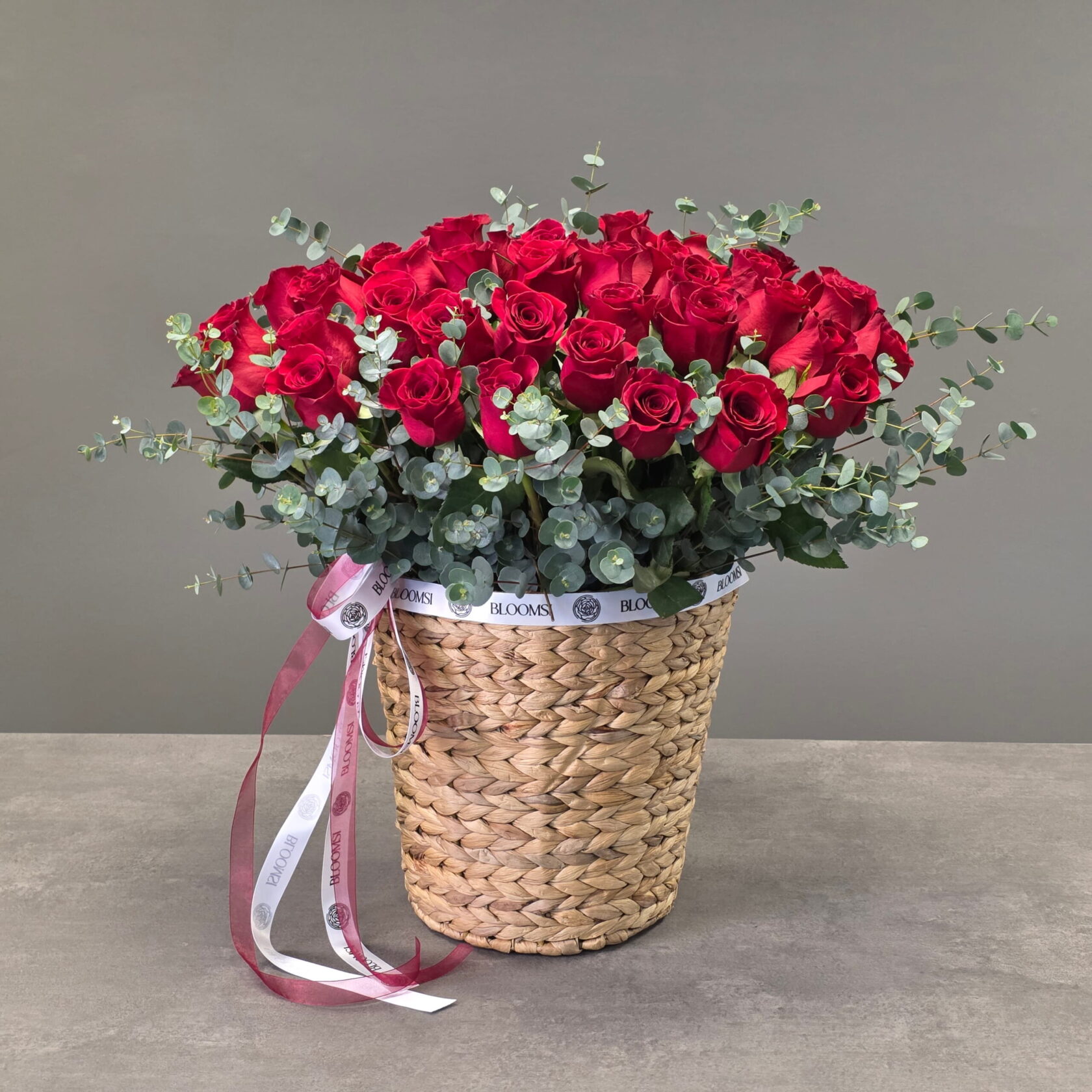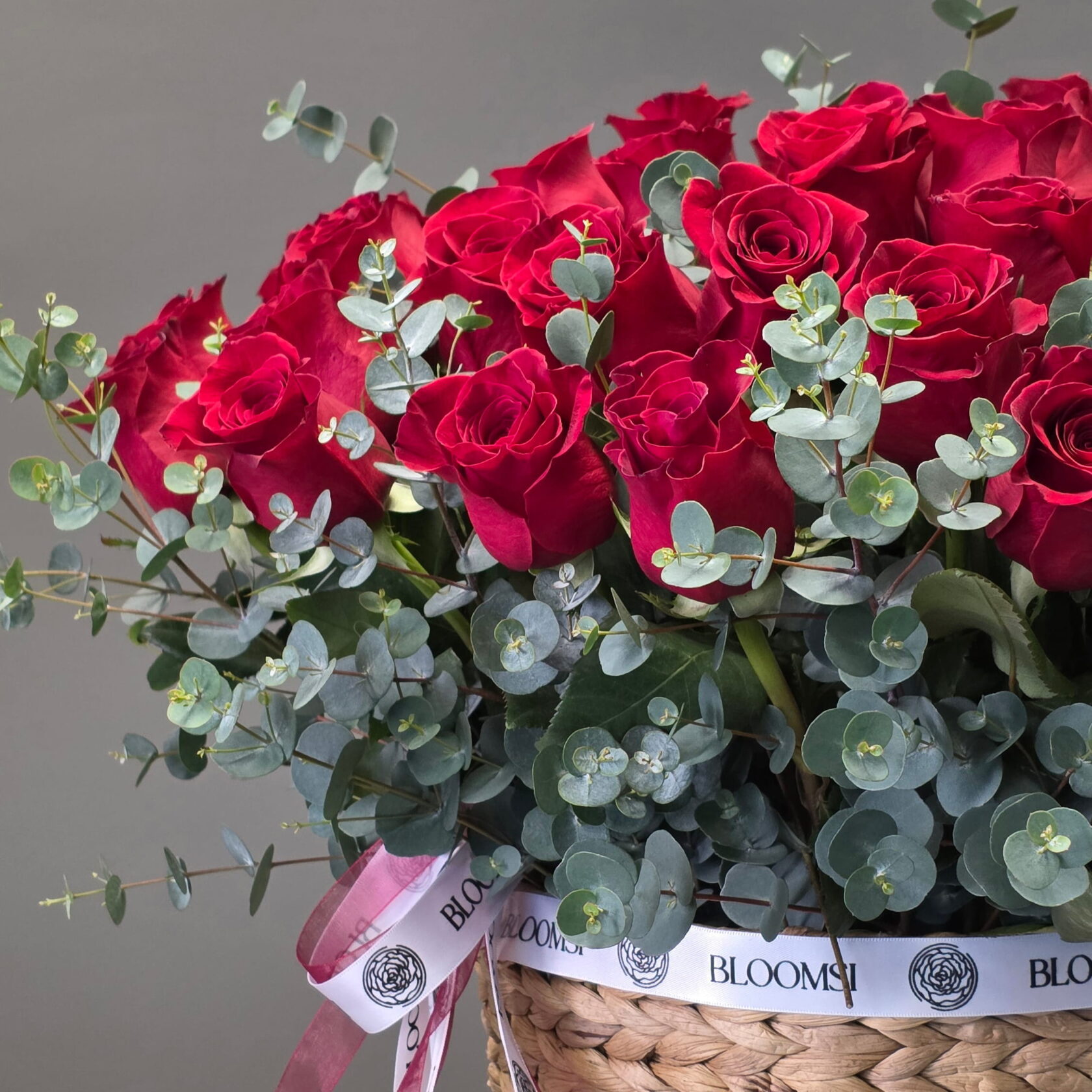 The roses have been carefully selected for their deep red colour, velvety petals and uniform bloom size. They are artfully arranged alongside fresh eucalyptus greenery, which adds softness, texture and modern botanical contrast. The natural woven basket provides warmth and structure, grounding the arrangement and enhancing its luxurious yet organic feel.