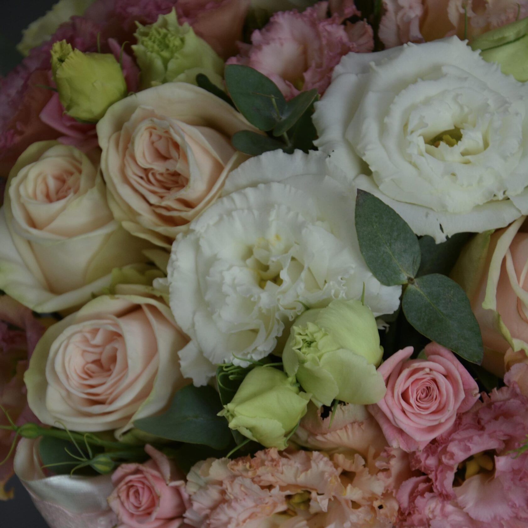 The Blush Garden Harmony flower box is a luxurious, romantic arrangement featuring premium roses and lisianthus, complemented by fresh greenery. It is presented in an elegant blush-pink hat box with decorative ribbon details. The soft pastel tones create a delicate and refined look that feels timeless and graceful.