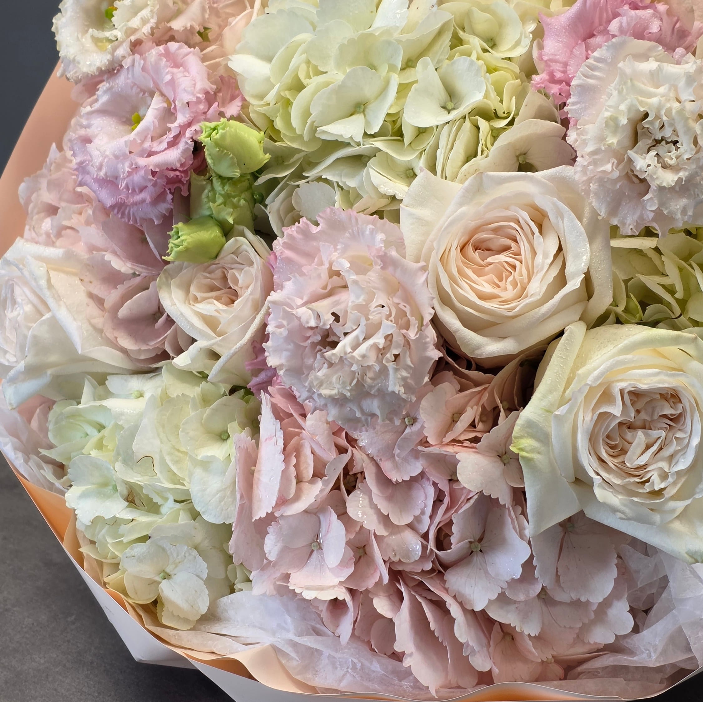 The bouquet is wrapped in soft blush paper with a clean inner tissue layer and finished with a satin bow for a polished BLOOMSI presentation. With its full, rounded silhouette and airy pastel palette, it makes an unforgettable gift and photographs beautifully from every angle.