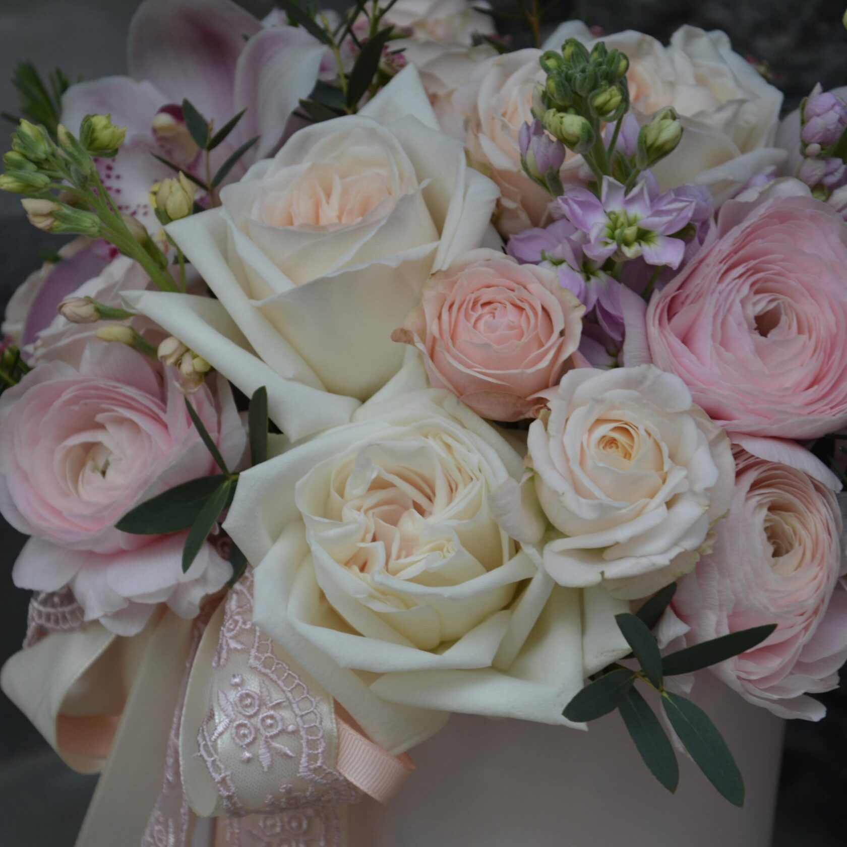 The Blush Ivory Romance flower box is an elegant, luxurious arrangement featuring premium blush and ivory roses, soft ranunculus, delicate seasonal blooms and refined greenery. All of these are beautifully presented in a blush pink hat box with decorative ribbon details. The soft pastel palette creates a romantic, airy and timeless look.