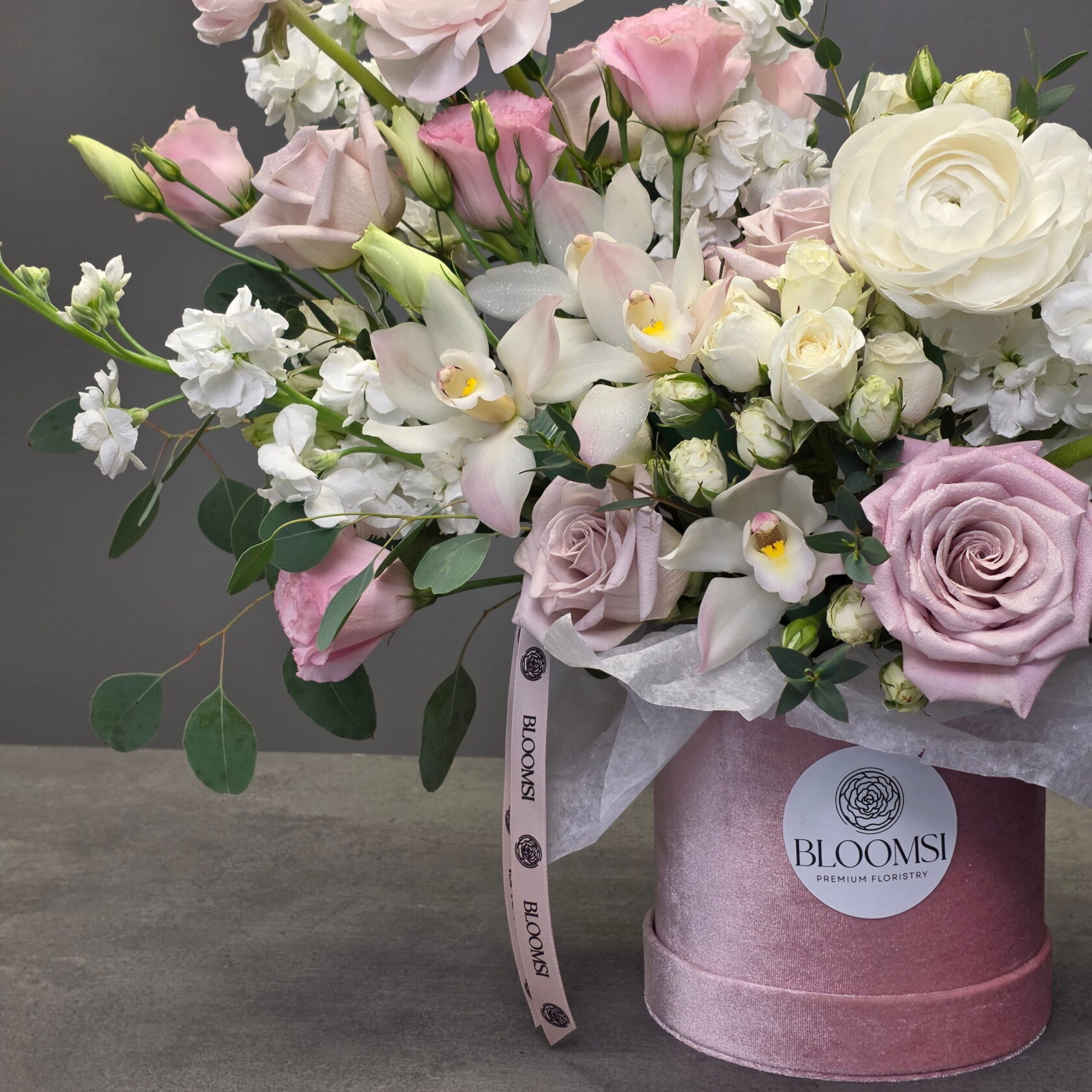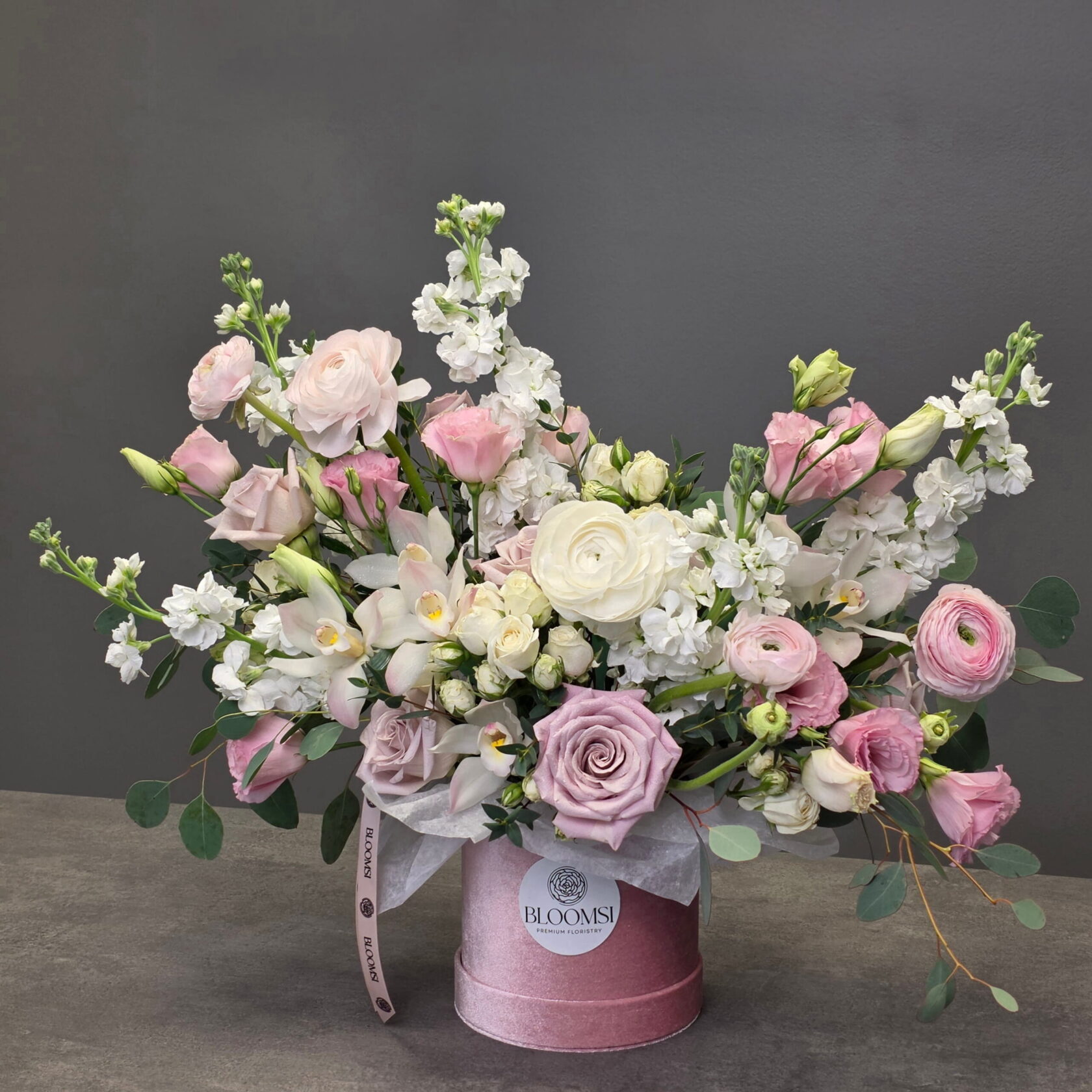 Blush Symphony is a luxury floral box created with a delicate balance of soft textures, gentle colour transitions, and premium blooms. Designed in blush pink, creamy ivory, and subtle lavender hues, this arrangement brings a refined and timeless floral presence.