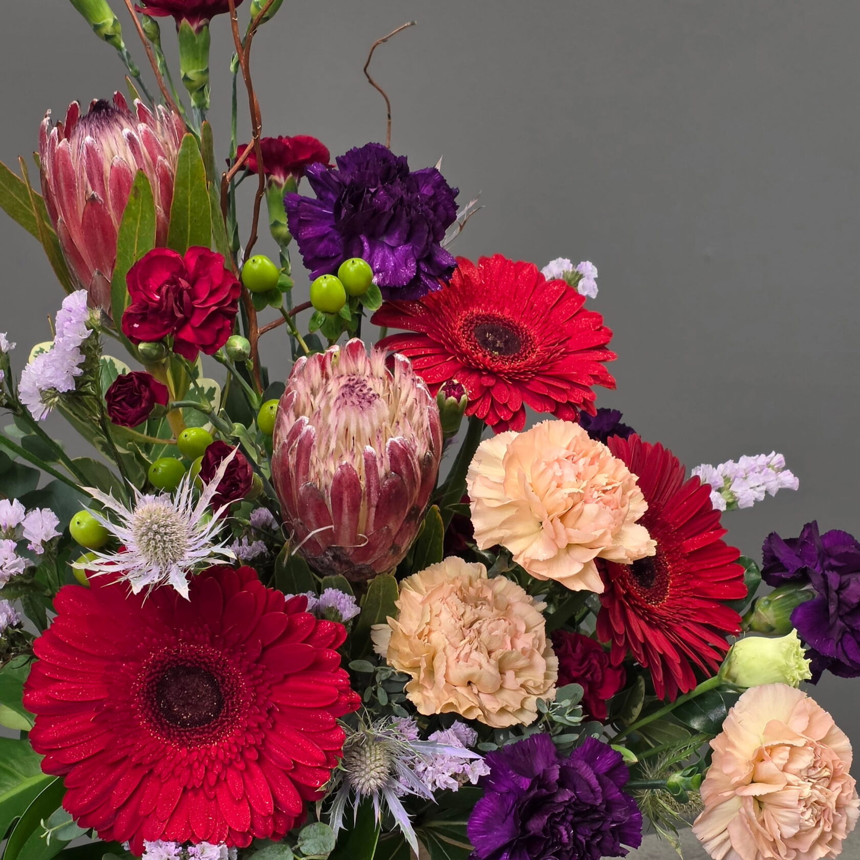 Botanical Edge is a modern luxury floral arrangement designed for those who appreciate artistic form and contemporary style. This designer composition features striking protea blooms, bold gerberas, textured carnations, accent flowers and fresh eucalyptus, arranged in a natural wooden box for a refined modern presentation.