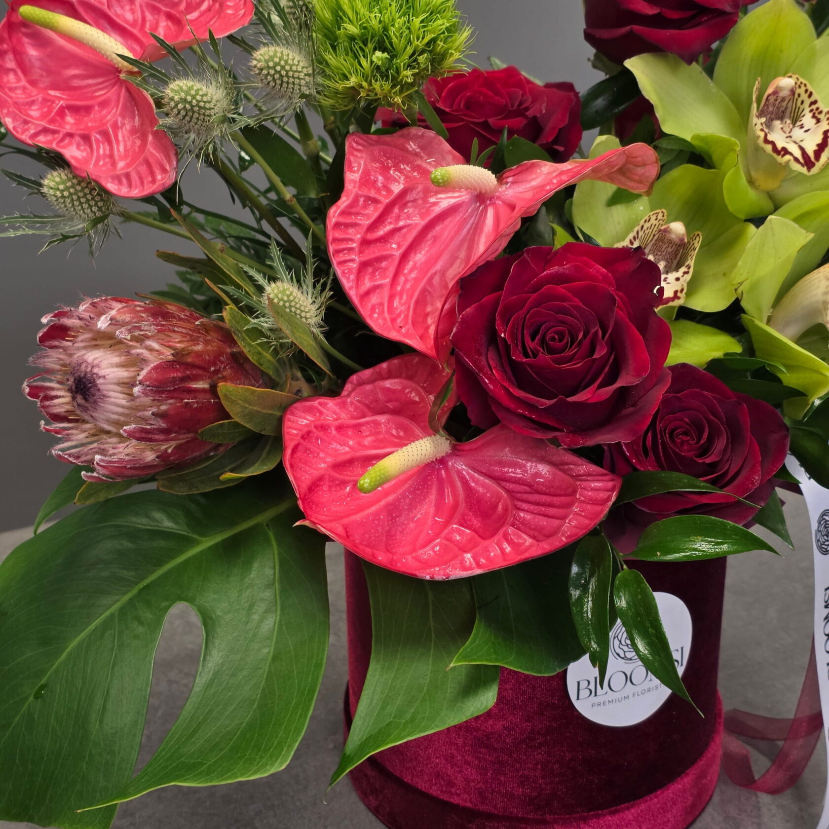 Thoughtfully arranged in a BLOOMSI signature velvet hat box and finished with branded ribbon detailing, this design blends rich colour tones with refined structure. Lush tropical foliage and architectural accents elevate the arrangement, giving it a modern, gallery-inspired presence.