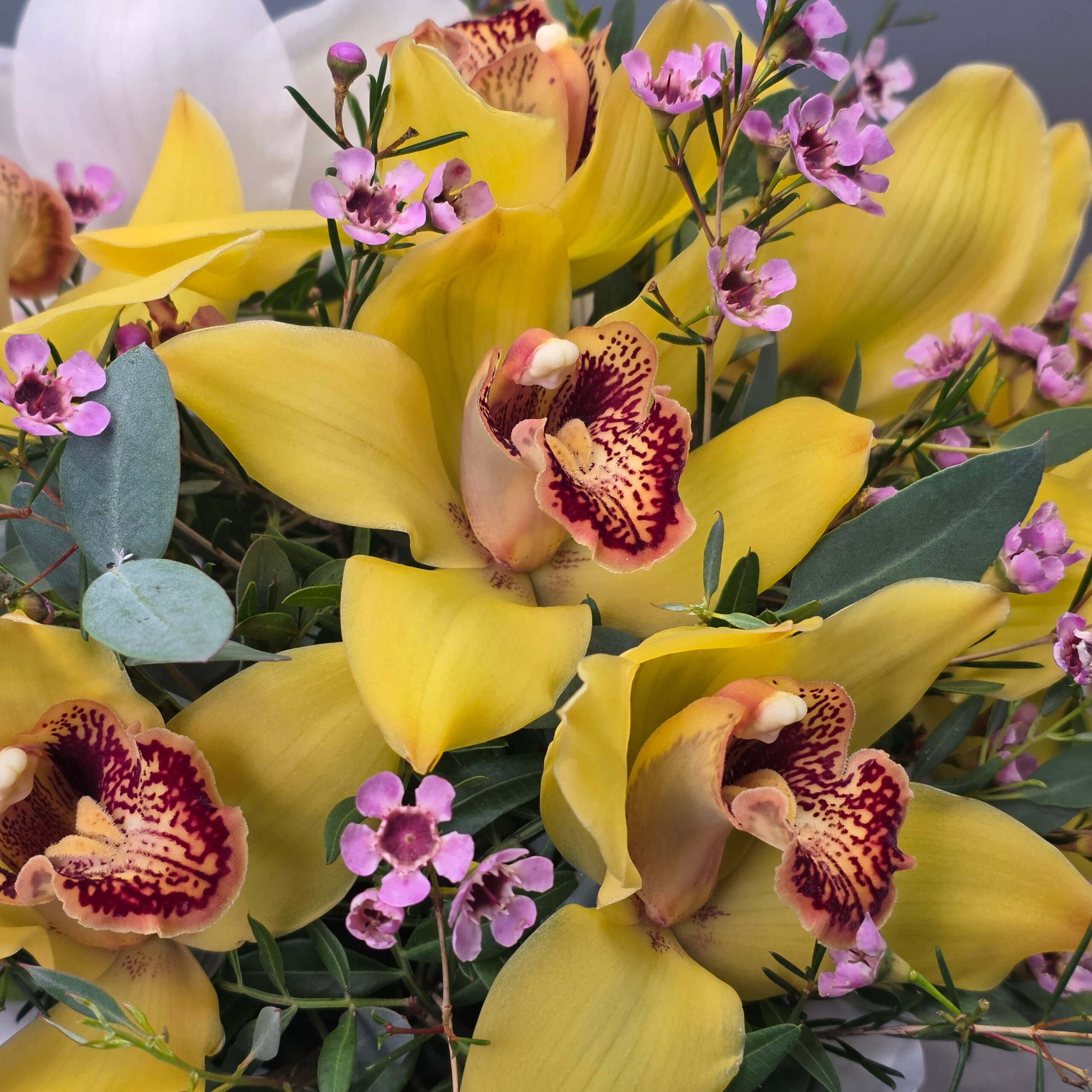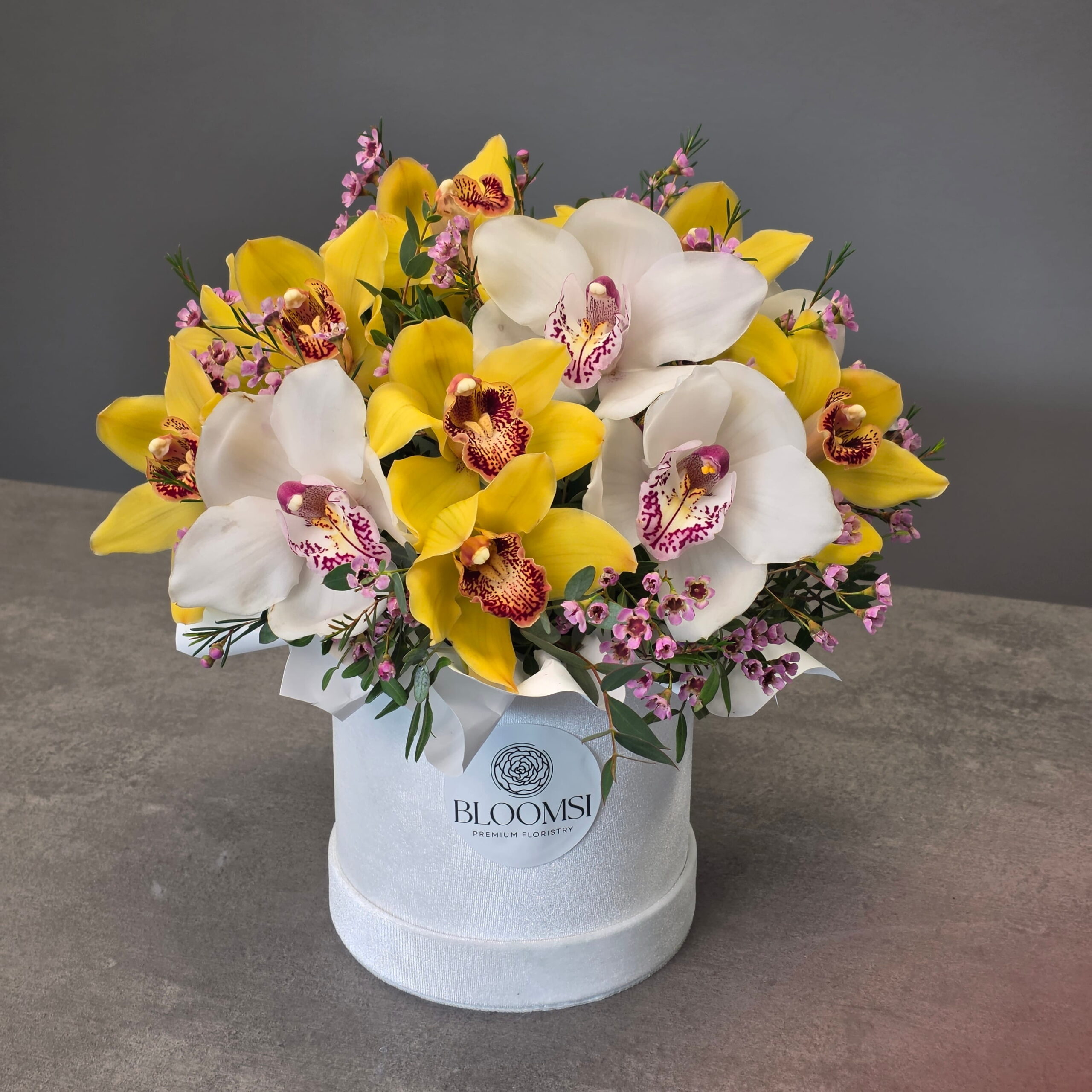 Bright, elegant and luxurious, our Golden Cymbidium Orchid Garden is a stunning floral arrangement designed to make a lasting impression. This premium composition features vibrant yellow cymbidium orchids, elegant white orchids and delicate seasonal accent flowers arranged in a stylish BLOOMSI hat box.