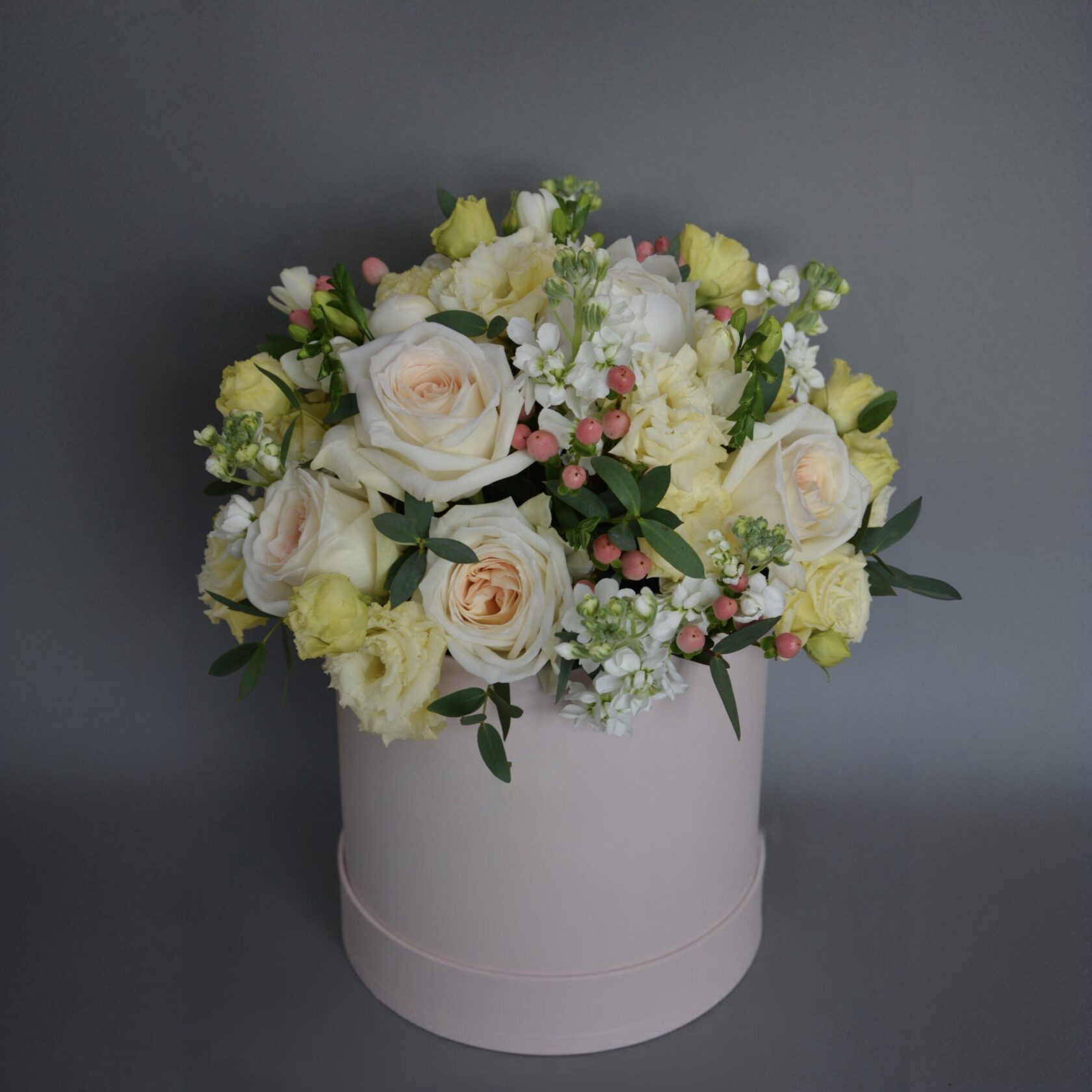 The Ivory Whisper flower box is a luxurious, refined arrangement featuring premium white and ivory roses, soft lisianthus, delicate seasonal blooms and fresh greenery. It is beautifully presented in a modern blush-coloured hat box. The light, airy colour palette creates a feeling of purity, elegance and timeless sophistication.
