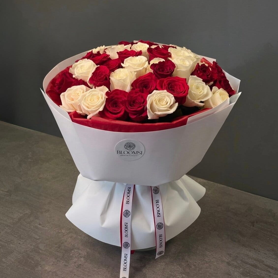 BLOOMSI florists handcraft this red and white rose bouquet using fresh, high-quality blooms. The bouquet looks rich, balanced, and luxurious. It is perfect for anniversaries, romantic moments, and meaningful everyday gifting.