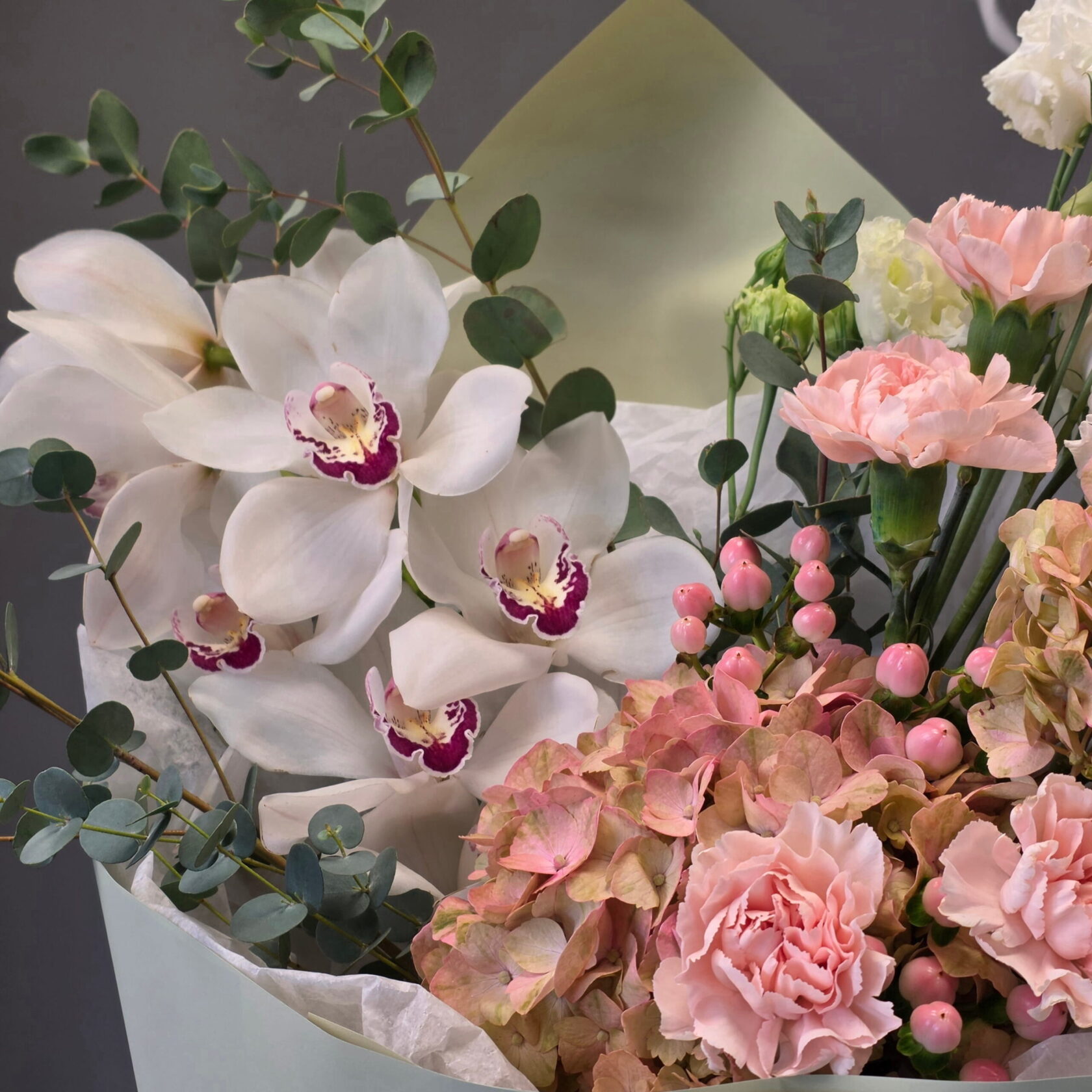 Graceful white cymbidium orchids create the focal point, surrounded by antique-toned hydrangeas, soft blush carnations, lisianthus, and delicate hypericum berries. Eucalyptus adds movement and a natural sculptural finish, giving the bouquet an airy yet luxurious presence.