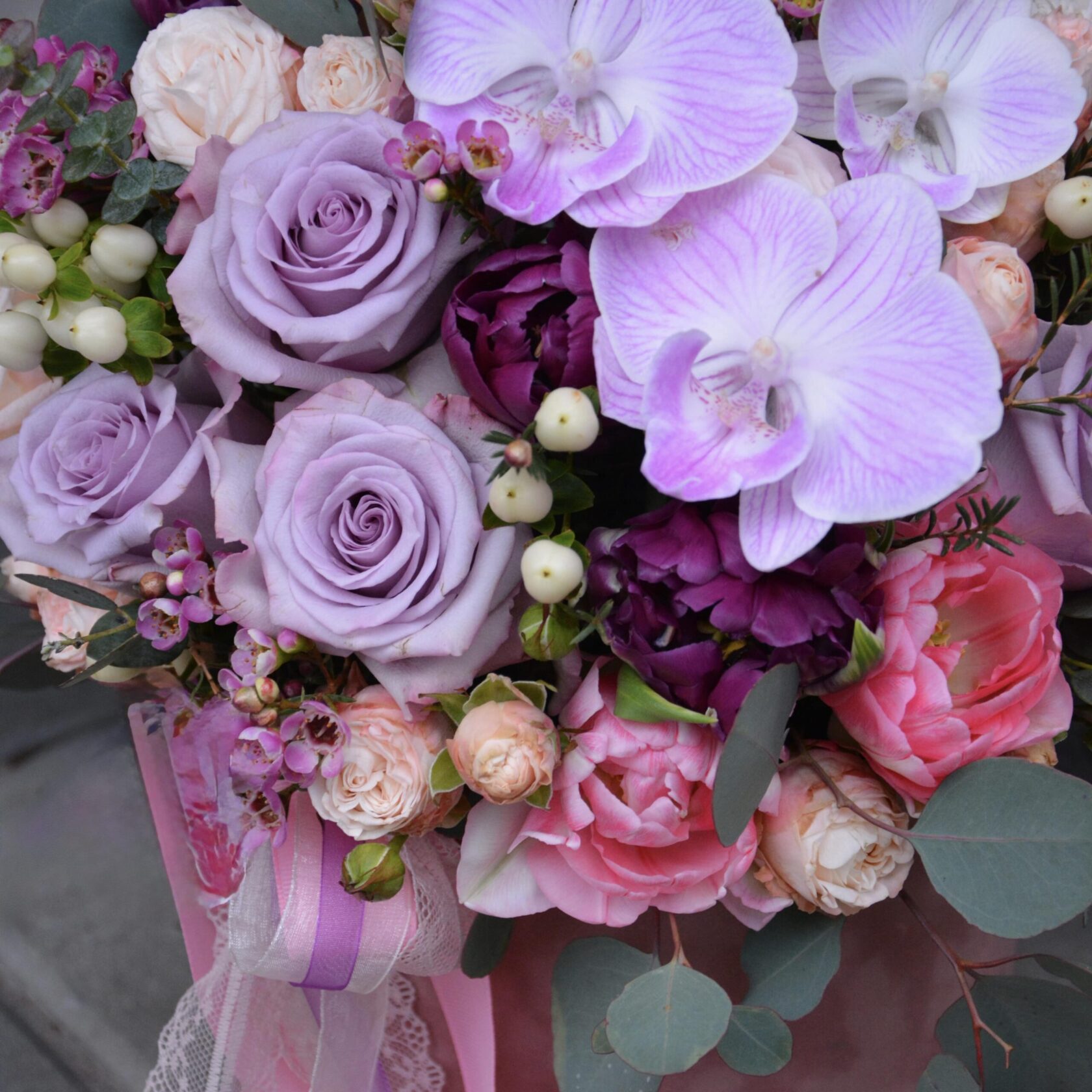 The Orchid Rose Reverie flower box is a graceful, luxurious arrangement featuring soft pink Phalaenopsis orchids, blush and lavender roses, delicate seasonal blooms and airy eucalyptus accents. Presented in a pink hat box with a velvet finish and flowing ribbon details, this composition exudes romance, lightness, and understated luxury.