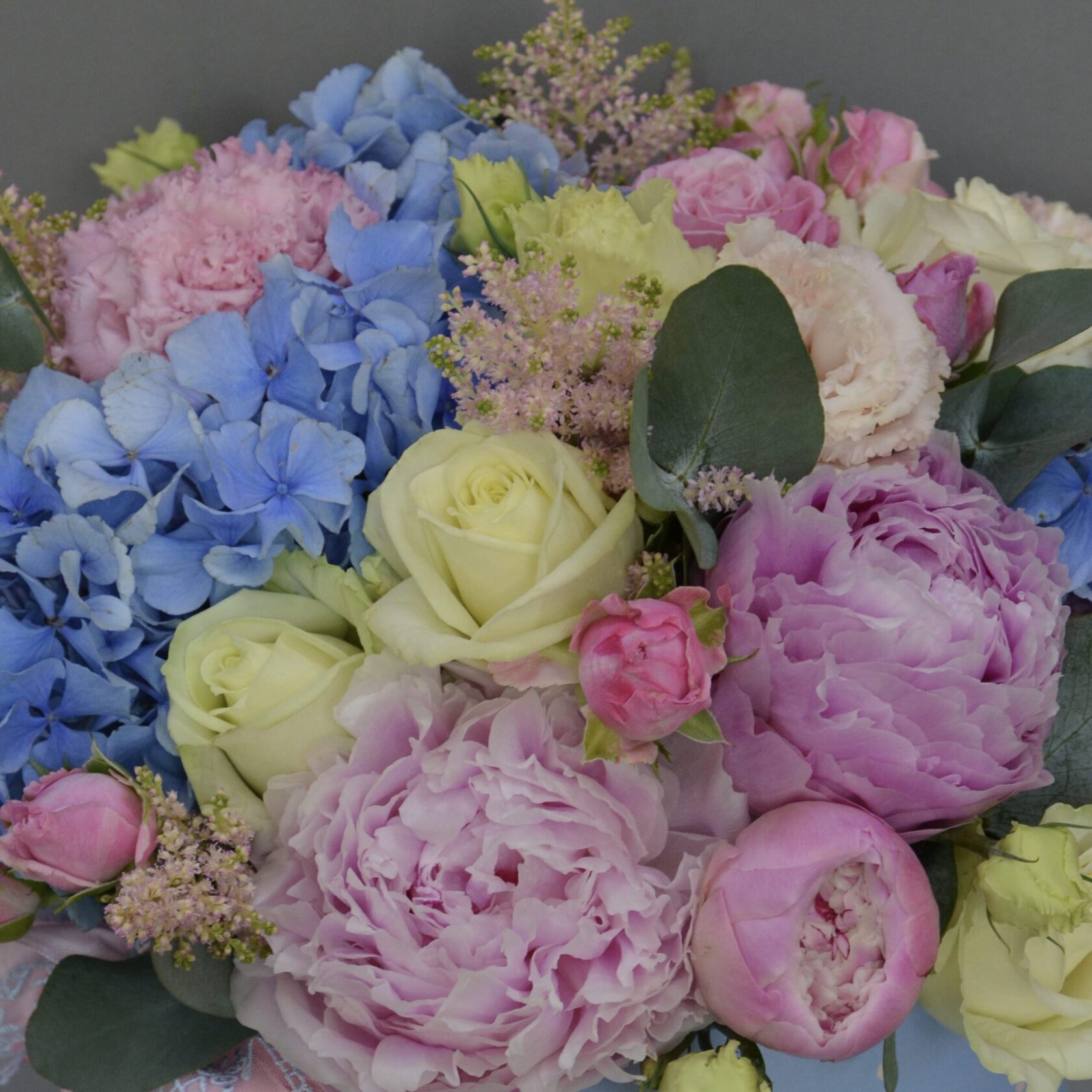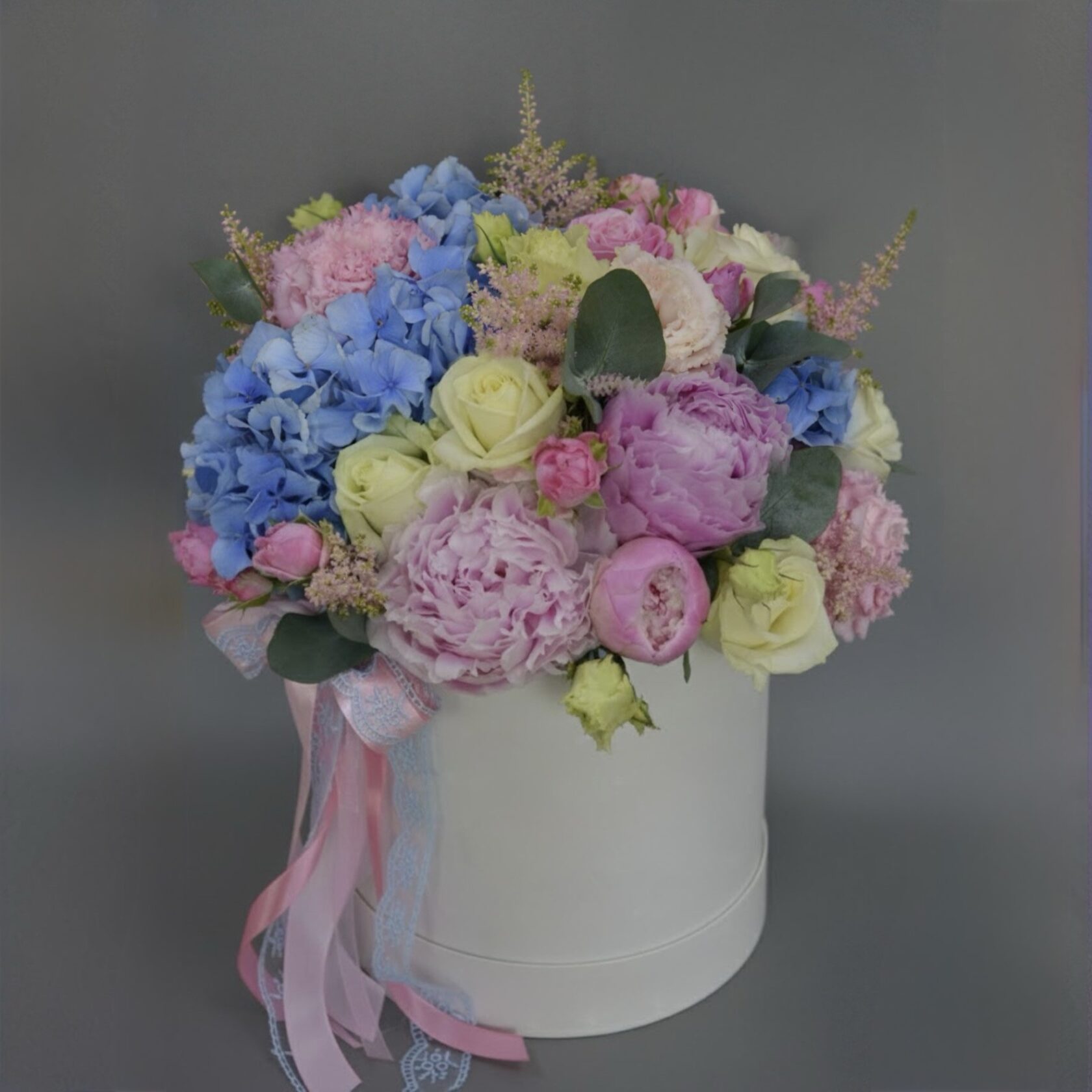 The Pastel Garden Dream flower box is a luxurious, romantic arrangement inspired by subtle colour transitions and the textures of a natural garden. It features lush pink peonies, blue hydrangeas, blush and ivory roses, gentle seasonal blooms and fresh greenery, all arranged in a clean white hat box with a flowing ribbon.