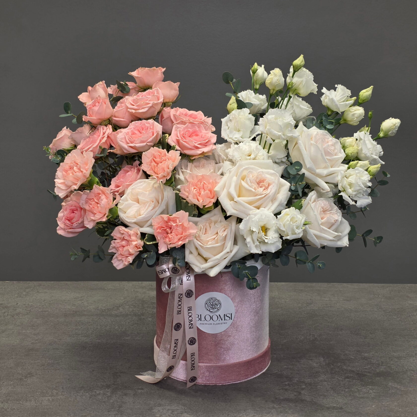 The composition features premium roses, spray roses, delicate carnations, white lisianthus, and stock flowers, complemented by fresh eucalyptus greenery. Each bloom is carefully selected and artfully arranged by BLOOMSI florists to achieve a soft, harmonious, and natural flow.
