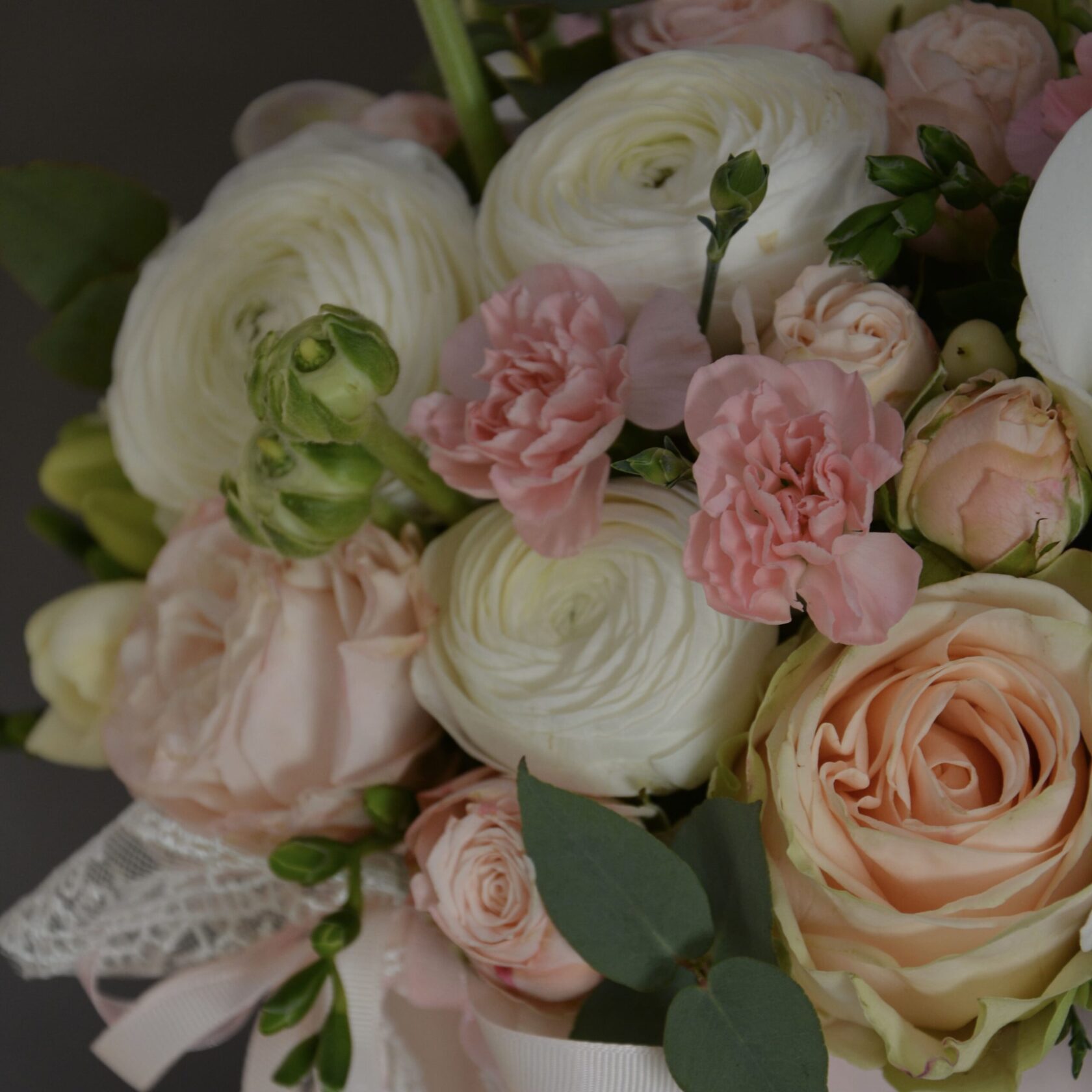 Rather than bold contrast, the design focuses on gentle colour transitions and graceful textures. The orchids introduce a sense of calm sophistication, the roses add warmth and romance, and the ranunculus bring layered depth and movement. The overall palette is light, harmonious and timeless.