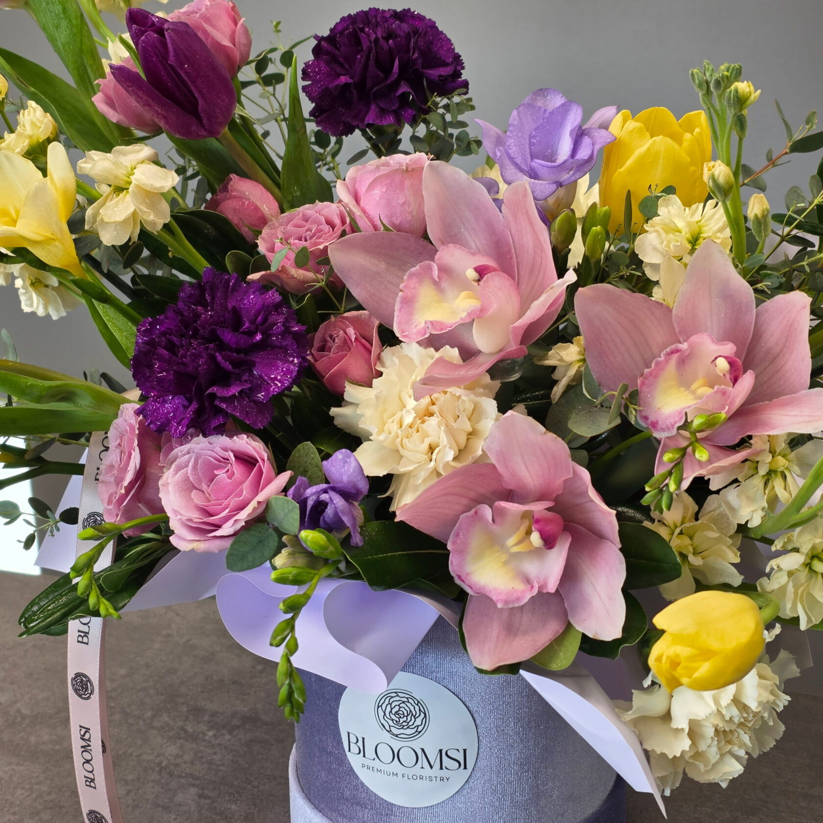 Graceful pink orchids become the visual highlight, surrounded by premium roses, spring tulips, deep violet carnations, and delicate seasonal blooms. Bright yellow accents bring light and energy, while lush greenery adds balance and movement.
