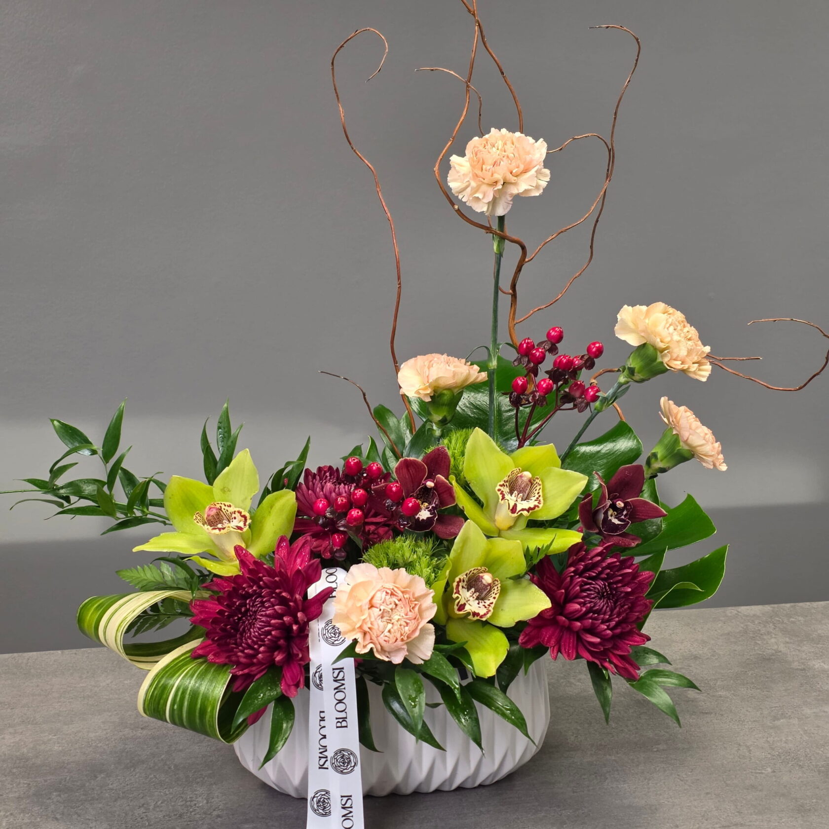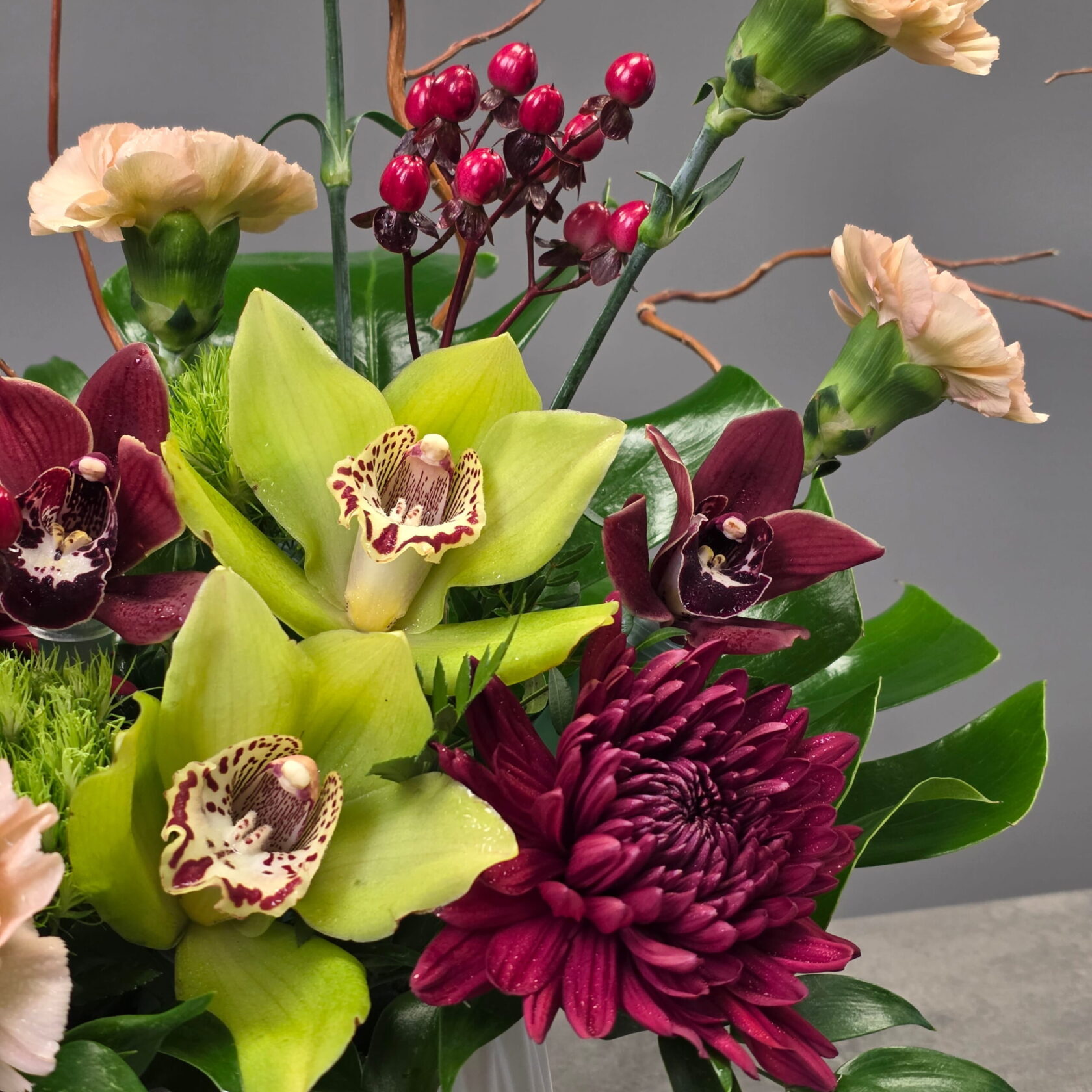Verdant Noir is a contemporary floral statement that combines architectural structure with rich, dramatic colour. Designed with sculptural lines and bold contrast, this arrangement brings together vibrant green cymbidium orchids, deep burgundy blooms, and textural botanical elements.